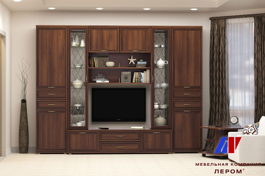 Гостиная Карина 17 - симметричная стенка, основу которой составляет широкая тумба для ТВ, на которой располагаются верхние шкафы для посуды со стеклянными фасадами, украшенными гравировкой.