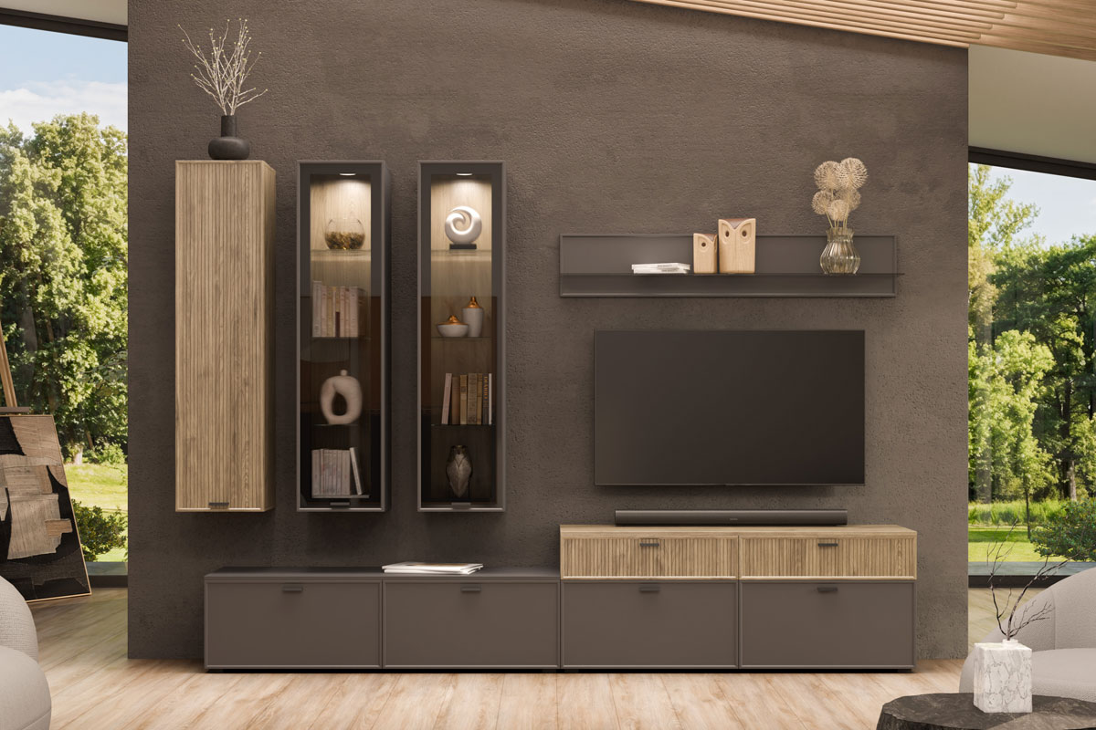 Гостиная СТЕЛЛА 5 - оригинальная ассиметричная композиция шириной 3 015 мм. Наличие подвесных вертикальных антресолей добавляет гостиной легкости.